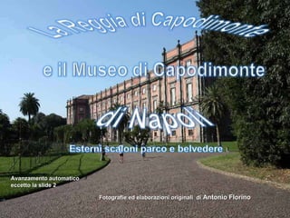 La reggia di Capodimonte, oggi museo, ospita una delle più importanti collezioni d'arte d'Europa, con opere di artisti come Tiziano e Caravaggio. Costruita da Carlo di Borbone nel 1734 come residenza di caccia, il museo si sviluppa su tre piani esponendo diverse collezioni artistiche. Il bosco di Capodimonte, ancora intatto, offre un'importante area verde per passeggiate nella città di Napoli.