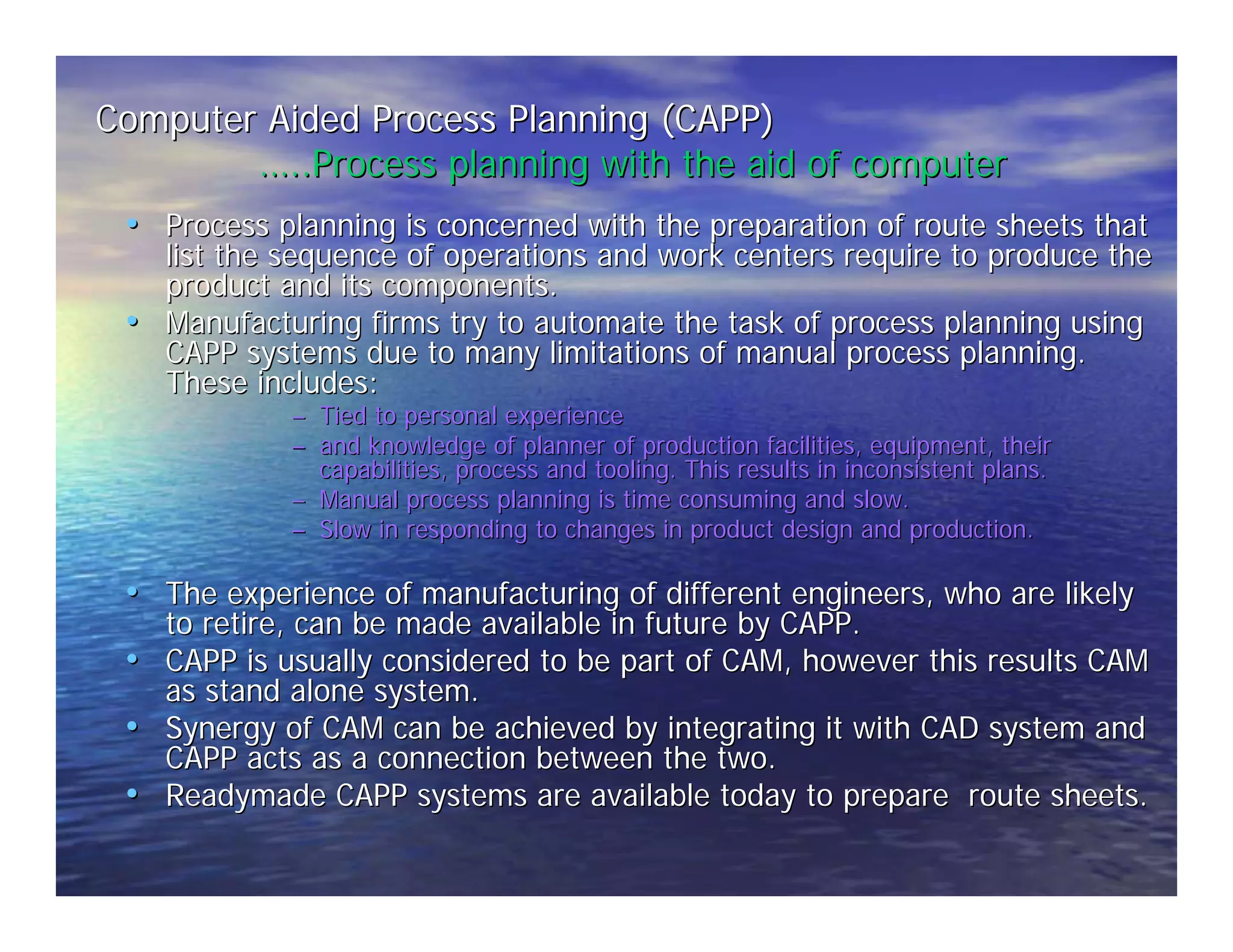 This document discusses Computer Aided Process Planning (CAPP). CAPP systems automate the process of generating route sheets that list the sequence of operations required to manufacture a product. This helps standardize plans and reduce inconsistencies compared to manual process planning. CAPP integrates with CAD and CAM systems to facilitate the connection between design and manufacturing. There are two main types of CAPP systems - retrieval CAPP systems that modify existing plans, and generative CAPP systems that automatically generate new plans based on part data and decision rules.