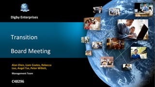 The board meeting agenda covered Digby's past performance, strategy, competitive advantages, competitor analysis, and management review. Over the past eight years, Digby achieved market leadership in the high-end segment through TQM focus on R&D cycle time, second product development, and exiting lower segments. Competitor analysis showed Baldwin and Erie posed threats that Digby responded to quickly. Management recommendations were to invest more in early TQM, sales/promotion, and product development to improve future performance.