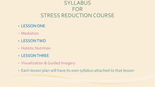 This document provides a syllabus for a stress reduction course that includes lessons on meditation, holistic nutrition, and visualization. The first lesson focuses on meditation and its origins, benefits including reduced stress, blood pressure, and cortisol levels. It discusses practicing meditation which can be done individually or in a group using various aids and focusing on the present moment. The lesson includes participating in a 5-minute guided breathing meditation and discusses using meditation to help manage pain and other health conditions. Resources for continuing a meditation practice in the community are also provided.