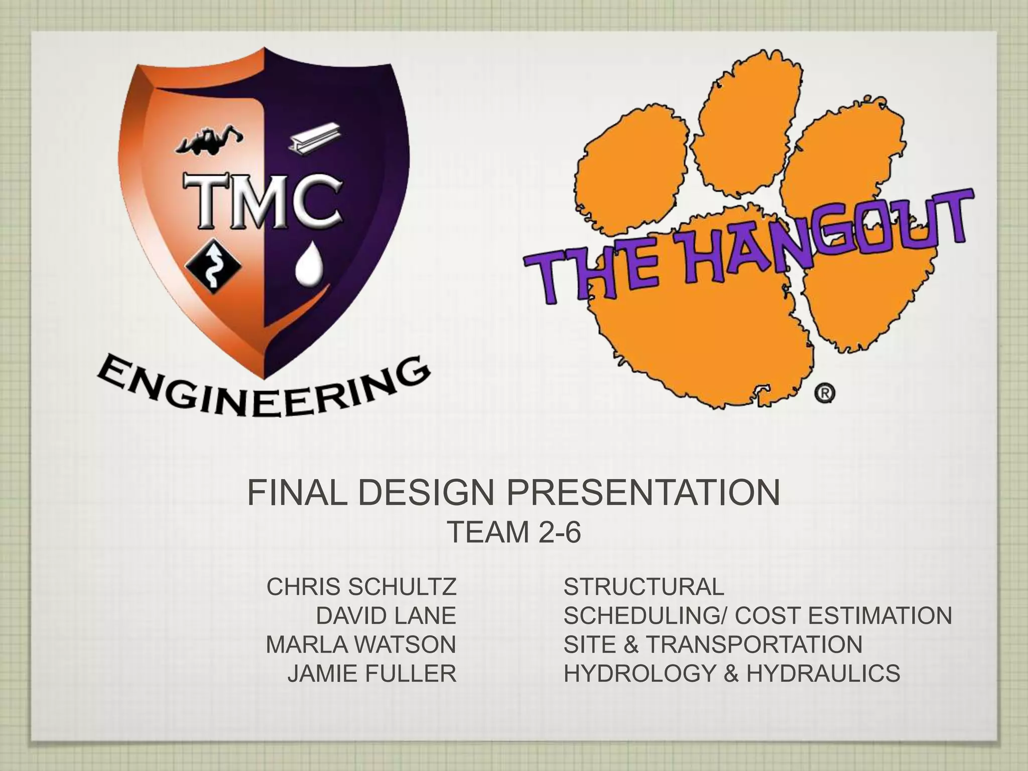 The team presented the final design for The Hangout entertainment facility. The design included a two-story, 25,943 square foot steel frame structure with two movie theaters, a restaurant, meeting rooms, and a late night dining option. The structural design utilized a steel deck roof and concrete slab floor supported by steel beams. A detention pond and 24 pipe structures were designed to manage stormwater runoff from the 19 impervious sub-basins such that post-development flows did not exceed pre-development flows.