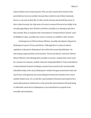 This document provides an analysis of how T.S. Eliot's poem "The Wasteland" references two other works - Thomas Middleton's play "Women Beware Women" and Shakespeare's poem "Venus and Adonis" - in its portrayal of gender roles and sexuality in early modern society. The analysis argues that Eliot underestimates the oppression of women in both works by focusing only on their use of female sexuality as a tool or weapon, without capturing the full criticism of gender relations. Comparing the two works shows that while they both depicted women using sexuality for gain or control, "Venus and Adonis" added the element of male sexuality also being objectified, which Eliot failed to