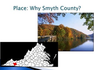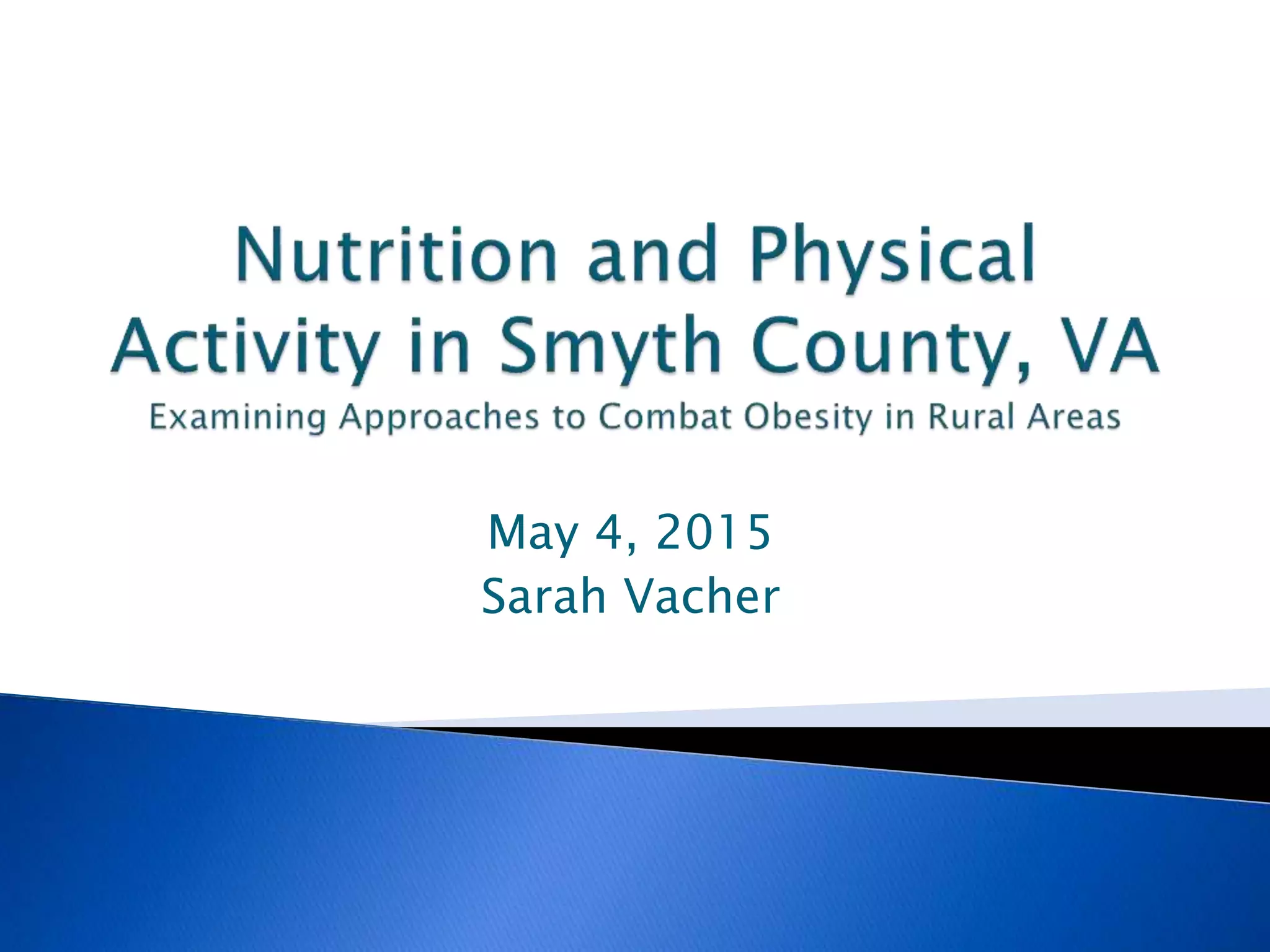 The document discusses the obesity-related health challenges in Smyth County, Virginia, where 31% of the population is obese. It outlines a six-week family-oriented weight loss program aimed at addressing these issues through community engagement and education on nutrition and physical activity. The program evaluates participant outcomes and emphasizes the importance of culturally relevant interventions and community partnerships for effective health promotion.
