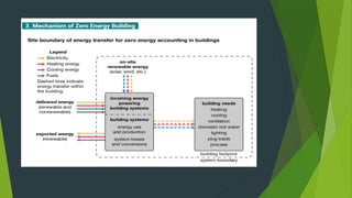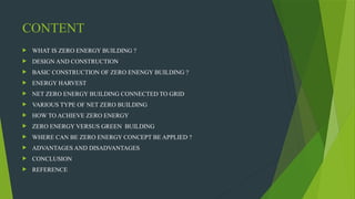 A zero energy building (ZEB) generates more energy than it consumes, reducing greenhouse gas emissions and reliance on fuels. Key approaches to ZEB include passive solar design, energy simulation, and renewable energy generation methods such as solar cells and wind turbines. ZEB can be applied in various settings, offering advantages like reduced living expenses and environmental compatibility, although it faces challenges due to a lack of skilled designers and limited solar energy availability in certain areas.