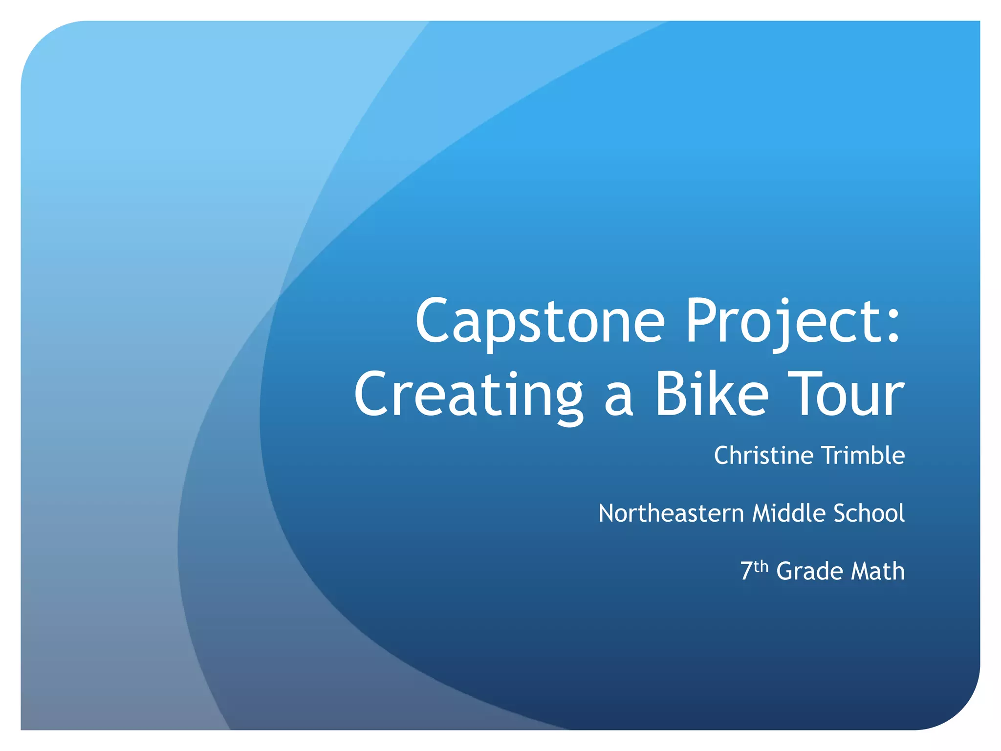 The document describes a 7th grade math capstone project where students will work in groups to plan a 3-day bike tour. They will create graphs of time and distance for each tour day, write an equation to determine potential profit, and develop a marketing component. The teacher will provide mini-lessons on creating graphs and equations. Students will research bike tours, plan costs and routes, and present their project to the class. The goal is for students to apply math skills to an authentic project and take the lead in their own learning.