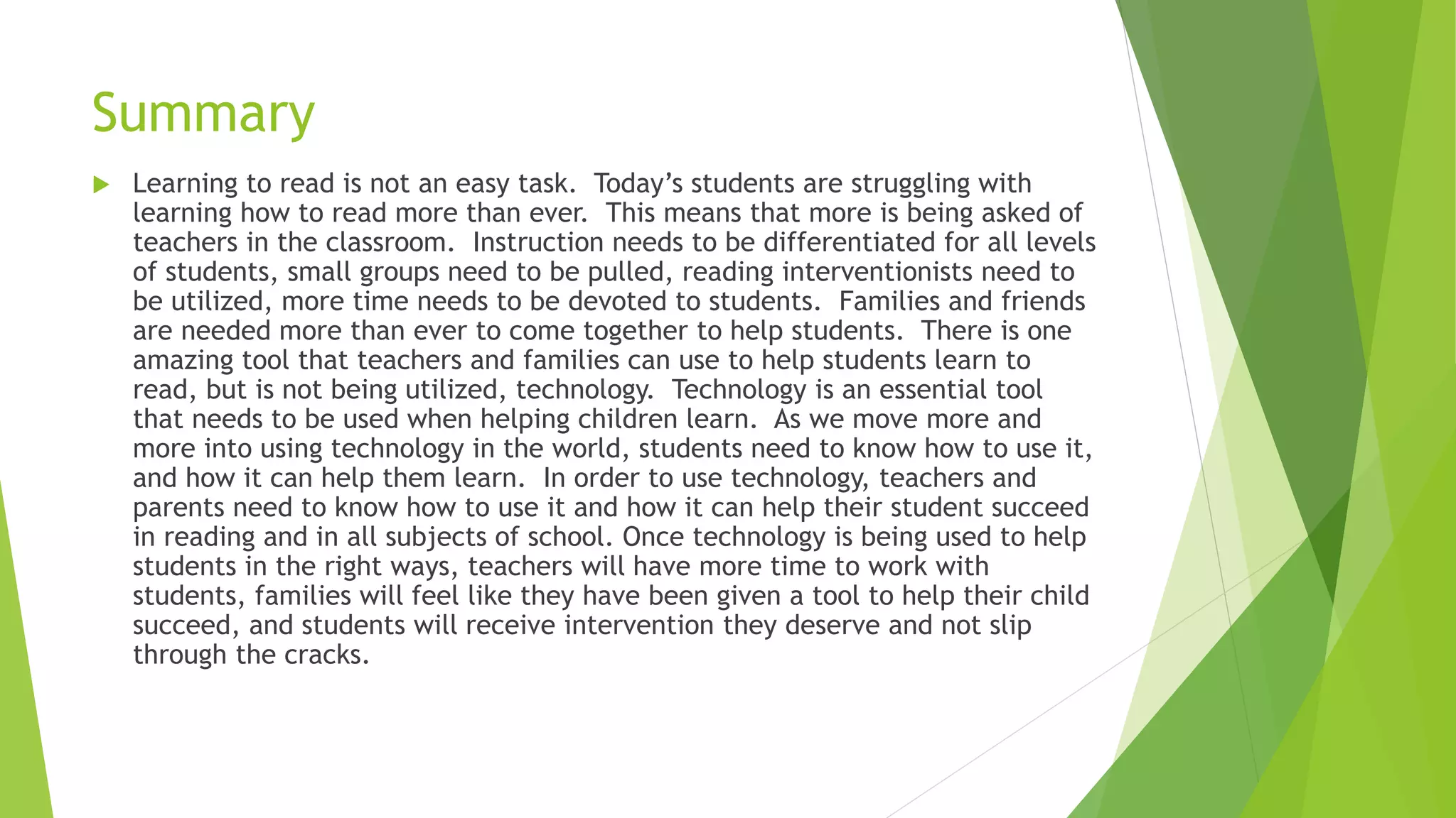 This capstone project aims to show how technology can be used to help students struggling with reading. The project creator will produce an informational pamphlet highlighting research on the benefits of technology in teaching reading. A booklet will also be created demonstrating different technologies and apps that can be used to teach reading skills. Workshops are proposed to train teachers and families on using these tools to provide reading intervention and practice. The goal is to free up teacher time by allowing other students to work independently with technology while the teacher focuses on small groups or individual students.