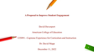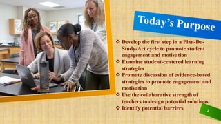 This document proposes implementing a Plan-Do-Study-Act cycle to promote student engagement in social studies classrooms using student-centered learning strategies. It recommends that social studies teachers in a school collaborate to design lessons that give students more autonomy, choice, and input through approaches like project-based learning and culturally responsive teaching. The document discusses potential barriers to student engagement and collecting data to study the impact of the proposed strategies on student motivation and outcomes.