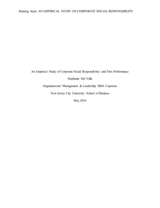 This document is a capstone thesis submitted by Stephanie Del Valle to New Jersey City University in partial fulfillment of an MBA degree. The thesis investigates the relationship between corporate social responsibility (CSR) and financial performance through an empirical study of Coca-Cola and Microsoft. The thesis acknowledges those who supported the author's work. It then provides an abstract that outlines the purpose of studying the relationship between CSR and financial performance, which some previous studies have found to be positive, negative, or nonexistent. The thesis proposes using CSR ratings and various financial metrics as dependent and independent variables for empirical testing. It concludes that differences in financial performance did not impact CSR ratings for Coca-Cola and Microsoft, indicating no direct