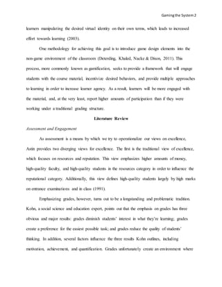 2) Literature suggests current assessment focuses too much on performance and grades, diminishing learning. Alternative approaches like cooperative learning and problem-based learning increase engagement by emphasizing mastery over completion.