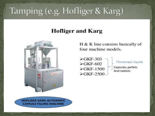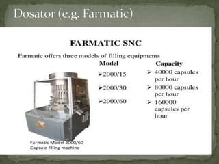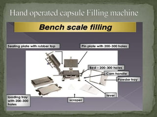 This document describes a capsule filling machine. It has several components: a bed and loading tray with 200-300 holes, a powder tray, a pin plate, a lever, cam handle, sealing plate with rubber top, and scraper. The machine is widely used in the pharmaceutical industry. It can fill 6000 capsules per hour and is made of stainless steel. All operations are manual. It uses a volumetric filling method where powder is filled to the upper surface of a body containing ring. Major manufacturers of these machines include Eli Lilly, Park-Davis, and Farmatic.
