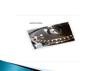 The document discusses capsule filling machines and the capsule filling process. It describes the Profill 100 capsule filling machine which uses manual filling and does not require expensive equipment. It then explains different filling principles like vibratory filling and dosing disc/dosator principles. The document also covers capsule sealing methods, quality control steps, and types of capsule filling machines. It provides information on soft gelatin capsules, including formulation, manufacturing methods like the plate process, and advantages over hard capsules.
