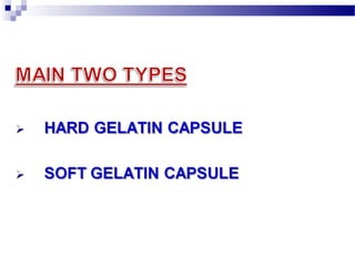 1. Capsules can be used to mask unpleasant drug tastes, smells, or appearances. They also allow powders to be dispensed uncompressed, aiding faster drug dissolution and absorption compared to tablets.