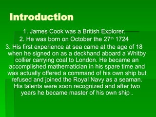 James Cook was a British explorer born on October 27, 1724, who became notable for his voyages in the Pacific, including the discovery of Antarctica. He circumnavigated Antarctica and significantly contributed to European knowledge of the region through his detailed navigational charts. Cook's legacy is marked by his systematic approach to exploration, although he was killed in Hawaii on January 14, 1779, during a hostile encounter.