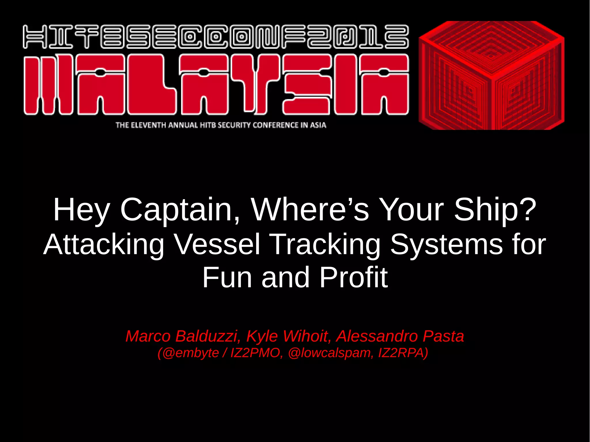 The document discusses the Automatic Identification System (AIS), highlighting its use in maritime safety for tracking vessels, collision avoidance, and other applications. It also outlines potential security vulnerabilities, including various spoofing attacks and the ease of exploiting AIS due to lack of authentication. The authors stress the need for improved security measures and responsible disclosure of their findings to relevant authorities.