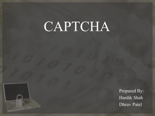 CAPTCHAs are automated tests used to distinguish humans from computers by presenting problems that are easy for humans to solve but difficult for computers. The term was coined in 2000 by researchers at Carnegie Mellon University and stands for "Completely Automated Public Turing test to tell Computers and Humans Apart". There are different types of CAPTCHAs including visual CAPTCHAs with distorted images or text, audio CAPTCHAs with distorted spoken words, and text-based CAPTCHAs involving text identification or simple questions. CAPTCHAs are commonly used to protect online polls, web registrations, and to prevent comment spam and email spam while allowing free access to services. However, they can sometimes be difficult for users