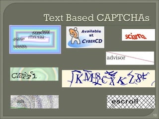 The document discusses CAPTCHAs, which are programs that can distinguish humans from computers by generating tests that are easy for humans but difficult for computers. It provides background on CAPTCHAs, describes common types including text, graphic, and audio CAPTCHAs, and discusses techniques for breaking existing CAPTCHAs. It then proposes a new approach to CAPTCHAs that uses distorted images of concrete objects from Google Images and requires users to identify the object from a list of words to address limitations in other CAPTCHAs.