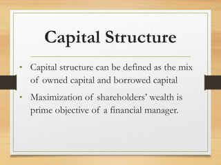 The document discusses different theories of capital structure: