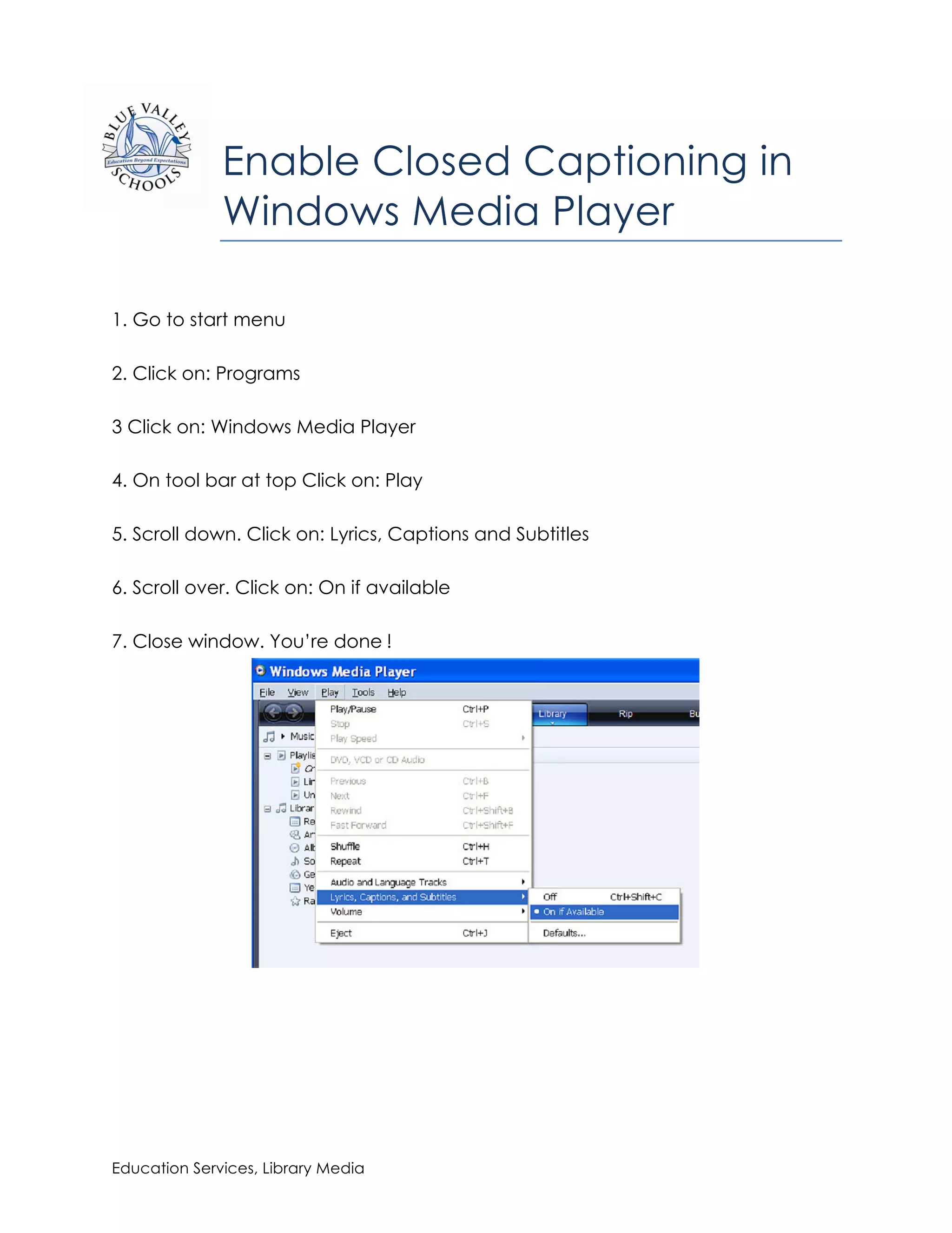 To enable closed captioning in Windows Media Player, open the program, click on "Play" on the toolbar, select "Lyrics, Captions and Subtitles" from the dropdown menu, and choose the "On if available" option. This will turn on closed captioning if it is available for any videos played through Windows Media Player.