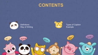 This document discusses different types of captions used to complement images. It defines a caption as a short piece of writing that provides context for a picture. The document then outlines guidelines for writing captions and describes several common types: identification bars name who is in an image; cutlines name who and what they are doing; summaries provide who, what, when, where, and why; expanded captions add how and quotes; and group identification captions name everyone in a group image. Examples are provided for each type.