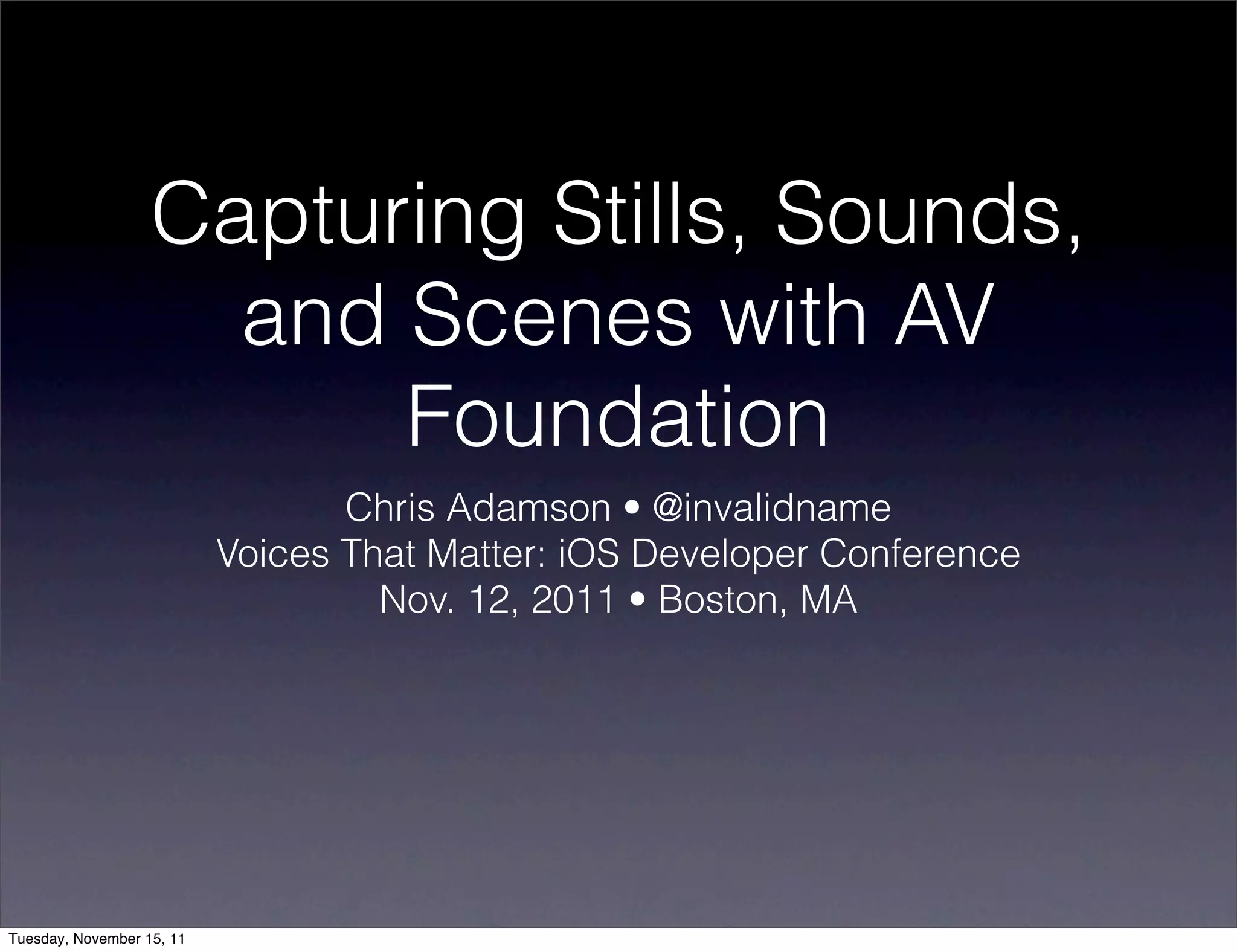 The document outlines media capture technologies in iOS using the AV Foundation framework. It discusses accessing capture devices, configuring sessions, managing inputs and outputs, and processing media, as well as providing practical code examples. Key topics include managing audio and video capture sessions, accessing device properties, and utilizing Core Image for features such as face detection.