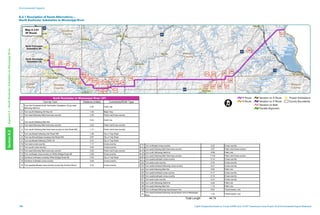 This document describes route alternatives for a transmission line project from the North Rochester Substation to the Mississippi River. It identifies 27 potential route options labeled from 1 to 77. The routes vary in their alignment from north to south and east to west. Some routes parallel existing transmission lines while others involve new transmission line construction in new areas. Environmental impacts will need to be evaluated for each route option.