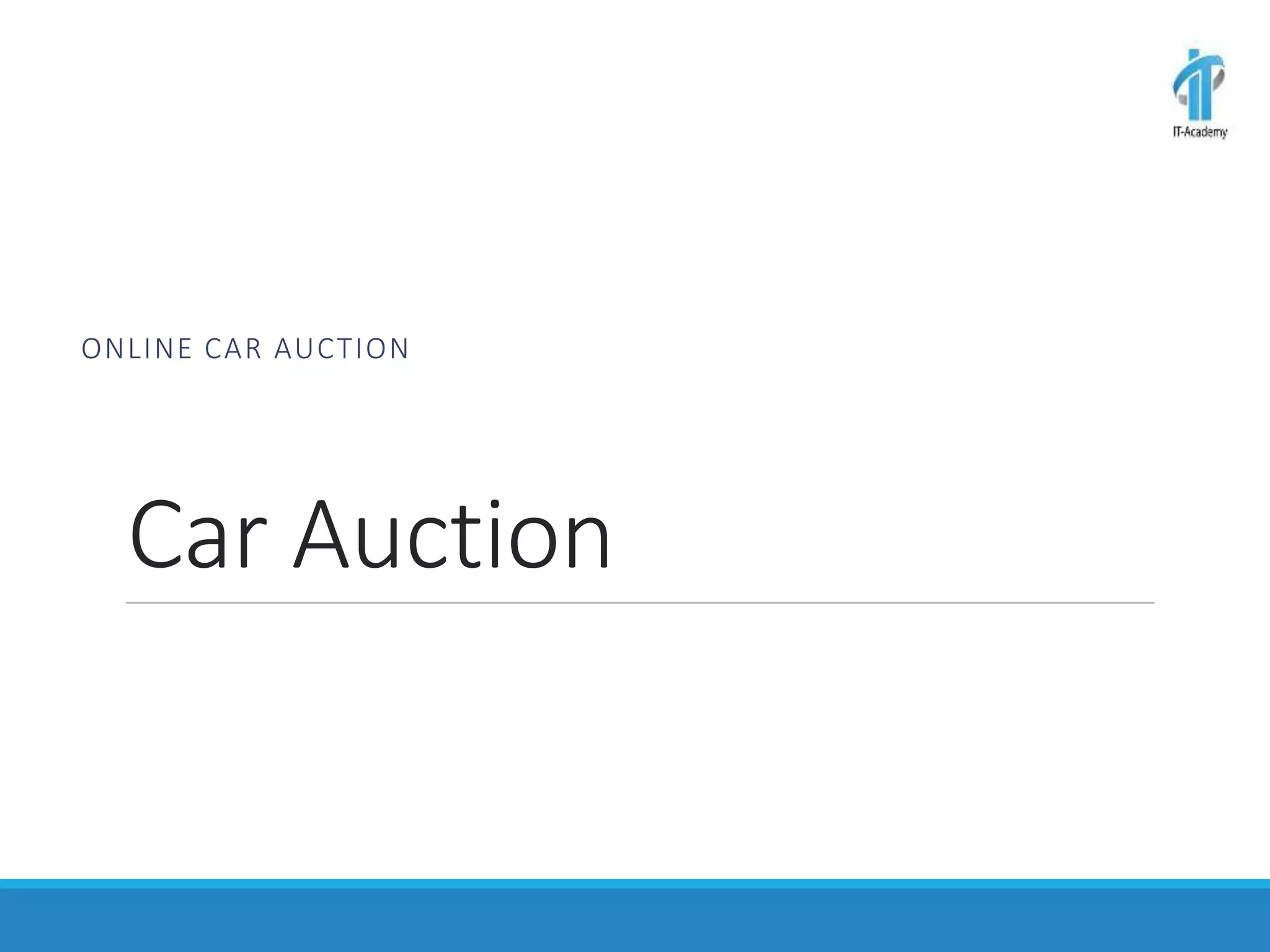This document discusses an online car auction service in Belarus. It allows sellers and buyers to find partners to buy and sell cars with minimum costs and terms. The service aims to help sellers find a beneficial price for their car within a month and helps buyers find cars within their budget that have been reviewed for quality. It also allows companies to buy and sell used company cars. The goals of the auction are to help buyers and sellers find a balanced price both find agreeable while the service guarantees proper vetting of vehicles and saves people time in the process.