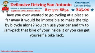Bike racks are used to transport bicycles on the exterior of a vehicle. There are three main types of bike racks: roof racks which allow use of the trunk but create wind resistance, trunk racks which are easy to use but take up trunk space, and hitch racks which are simple to install but can block visibility when backing up. Each rack type has pros and cons for carrying bikes long distances by car.