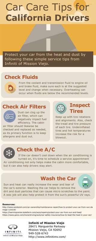 Protect your car from the heat and dust by following these simple service tips from Infiniti of Mission Viejo.