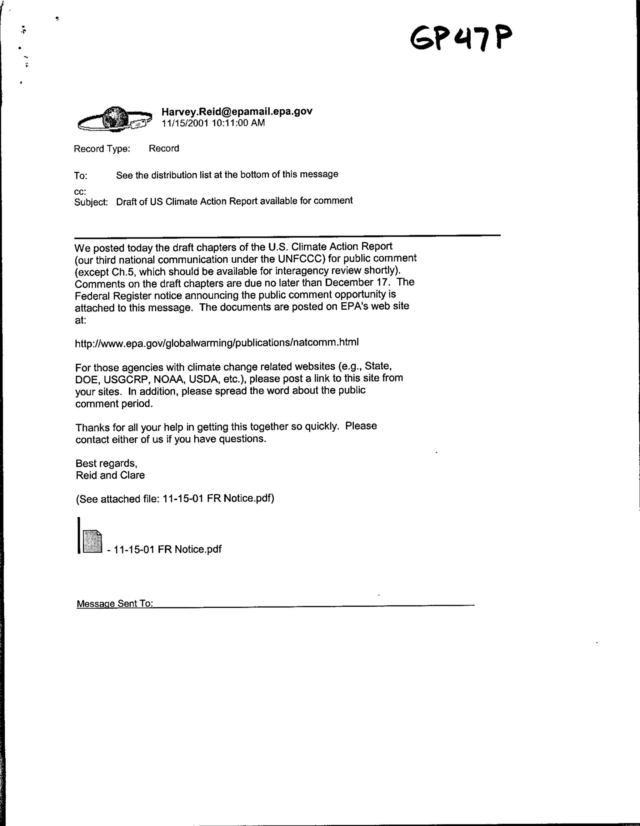 The document is an email announcing the availability of draft chapters of the U.S. Climate Action Report for public comment by December 17. It provides a link to the EPA website where the documents are posted and asks other agencies to post links to increase awareness of the public comment period. It thanks recipients for their help in preparing the report and providing contact information for any questions.