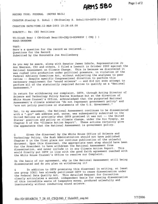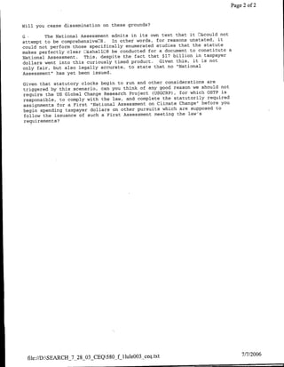 The document is a set of questions from Representative Joe Knollenberg regarding the National Assessment on Climate Change. Specifically, it questions why the Assessment is still being disseminated given that OSTP acknowledged it does not represent government policy. It also asks if OSTP will cease dissemination in response to a request under the Federal Data Quality Act. Finally, it argues the Assessment did not meet statutory requirements to qualify as a National Assessment.