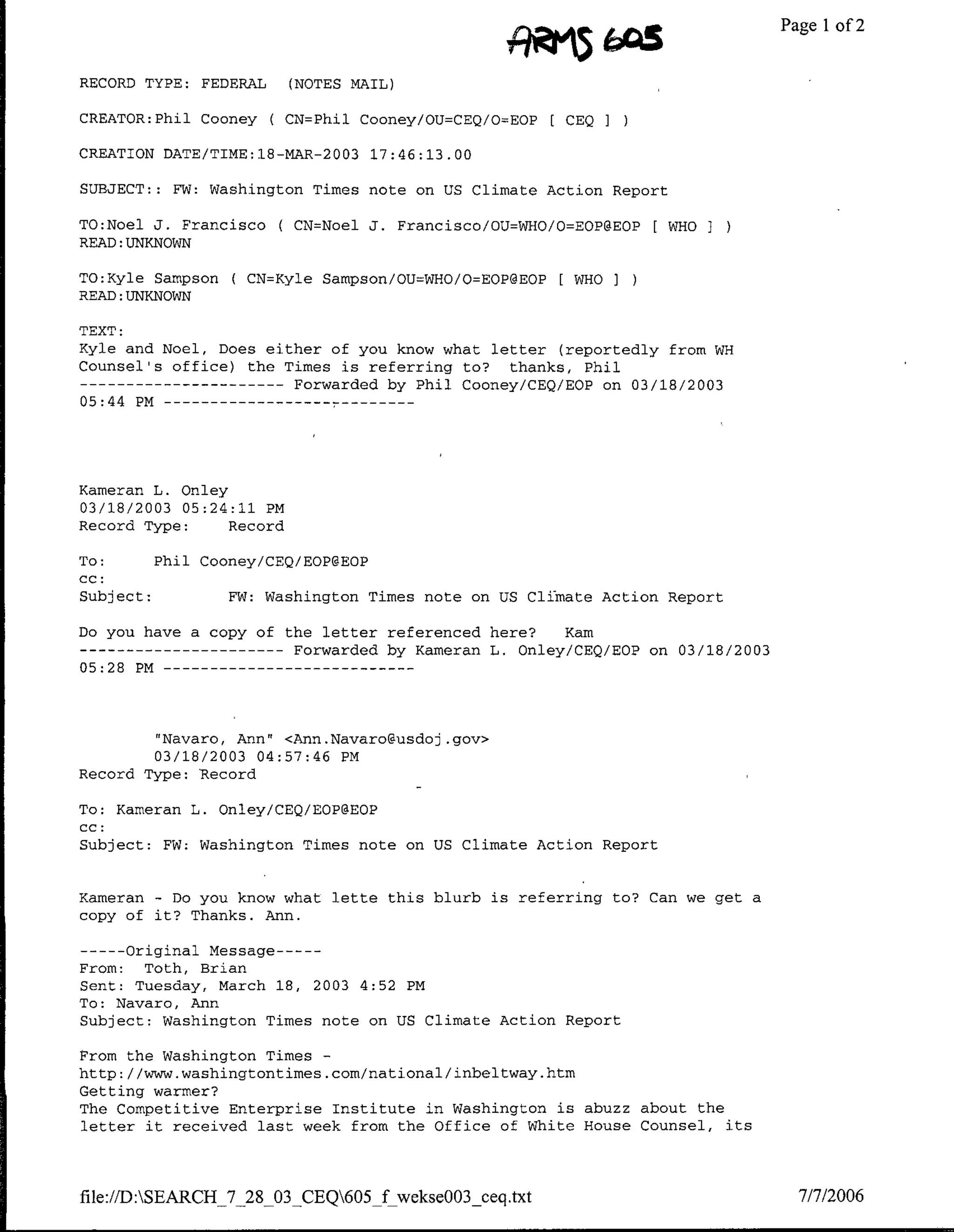 This email thread discusses a Washington Times article about a letter from the White House Counsel's office regarding the US Climate Action Report submitted to the UN. Phil Cooney emails two colleagues asking if either knows what letter the Times is referring to. Kameran Onley forwards the initial email to Ann Navaro, asking if she knows about the letter. Ann Navaro then forwards an article about the letter, which denies impropriety around the Climate Action Report but may contradict the administration's earlier distancing from the National Assessment on Climate Change.