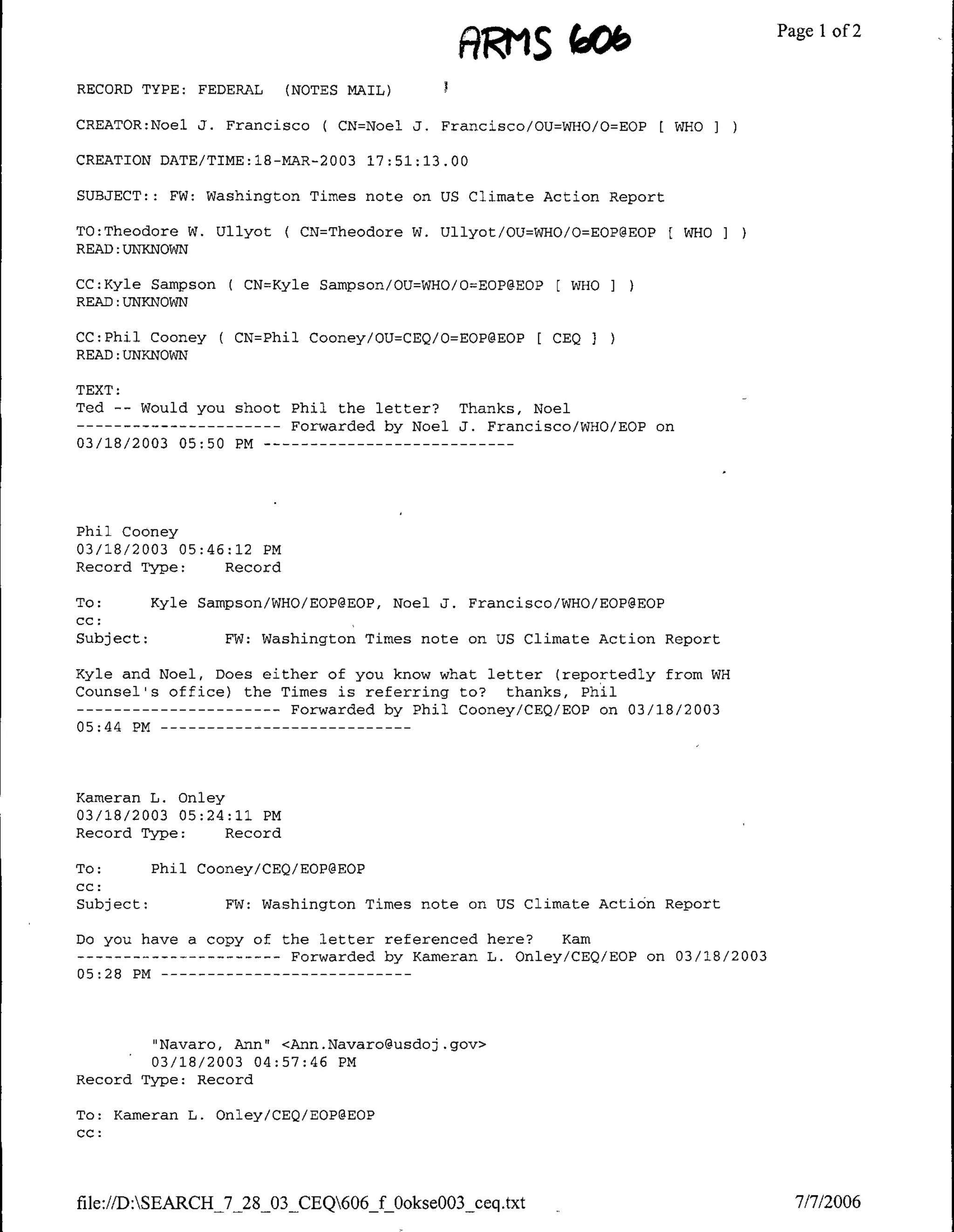 This email chain discusses a letter from the White House Counsel's office regarding the US Climate Action Report submitted to the UN. It notes that the Climate Action Report appears to repackage findings from an earlier National Assessment on Climate Change that the Bush White House had disavowed. Some are questioning whether the administration has flip-flopped by putting its stamp of approval on the latest climate report sent to the UN.