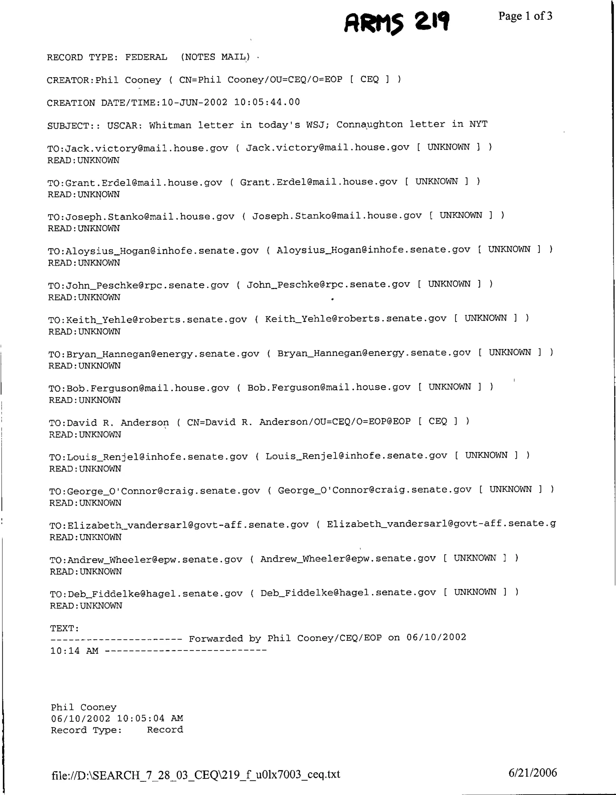 This document is an email from Phil Cooney at the White House Council on Environmental Quality forwarding two letters about the administration's climate change policy. The first letter is from EPA Administrator Christie Whitman responding to an editorial criticizing the administration's position on the Kyoto Protocol. Whitman defends the administration's unified opposition to Kyoto. The second letter is from James Connaughton, the CEQ chairman, responding to a New York Times article about the Climate Action Report. Connaughton argues the report is consistent with previous statements from President Bush acknowledging uncertainties in climate science.