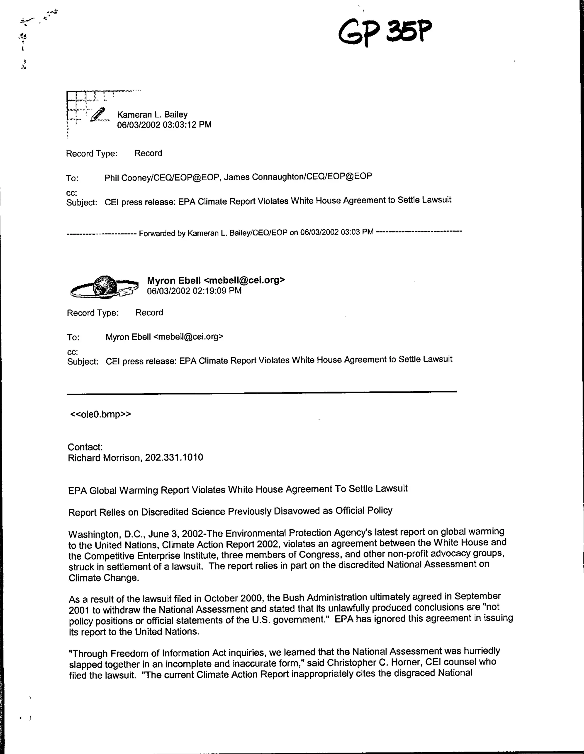 The document summarizes a press release from the Competitive Enterprise Institute (CEI) criticizing the EPA's Climate Action Report 2002 for relying on the discredited National Assessment on Climate Change. CEI had previously sued over the National Assessment and reached an agreement with the White House to withdraw it, so the press release argues the new EPA report violates that agreement. It also announces CEI has filed a petition to prevent distribution of the EPA report. Rush Limbaugh is quoted criticizing President Bush for appearing to "flip-flop" on global warming in the new report.