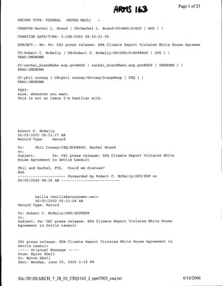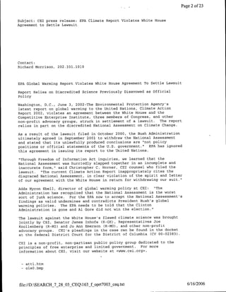 The document is an email exchange discussing a press release from the Competitive Enterprise Institute (CEI) alleging that the EPA's latest climate change report to the UN violates an agreement between the White House and CEI. The agreement settled a lawsuit brought by CEI and others over the National Climate Assessment. The press release states that the EPA report inappropriately cites the discredited National Assessment, which the Bush Administration had agreed to withdraw. It argues the EPA is ignoring the agreement by relying on the Assessment's findings.