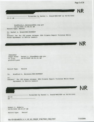 This document is an email chain discussing a press release from the Competitive Enterprise Institute (CEI) alleging that the Environmental Protection Agency's (EPA) latest climate report to the United Nations violates a prior agreement between the White House and CEI related to a lawsuit. The emails include forwarding of the original CEI press release, which claims the EPA report inappropriately relies on previously discredited climate science that the Bush Administration had agreed not to use as official policy. The chain discusses the potential implications and need to address the issue with the EPA.