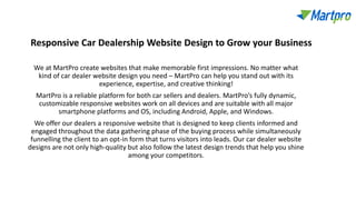 Martpro specializes in creating dynamic and customizable car dealership websites for buyers, dealers, and sellers, focusing on user engagement and lead generation. Their platforms are mobile-friendly, search engine optimized, and integrate robust third-party tools for effective management of listings and sales. Martpro's service includes ongoing support and maintenance, catering to dealerships of all sizes with features designed to enhance business operations.