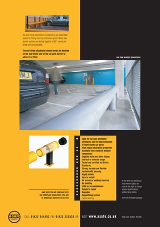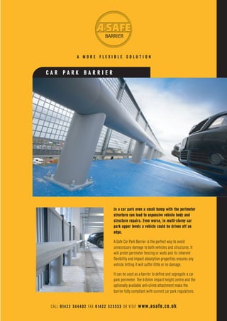 The document discusses a car park barrier that provides a flexible solution to avoid unnecessary damage from vehicles. It can protect walls, building supports, machinery, and equipment from wayward vehicles. The barrier is made of modular components and has high impact absorption properties to ensure vehicles hitting it suffer little to no damage. It can be used to define and segregate car park areas and comply with regulations.