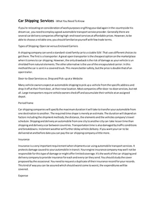The document outlines essential information regarding car shipping services, including types of shipping methods (open versus enclosed carriers) and the importance of choosing a reliable provider. It highlights factors such as door-to-door services, estimated delivery times influenced by various elements, and the necessity of insurance during transit. Additionally, it discusses how costs can vary based on shipping methods, vehicle types, and additional service charges.