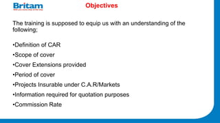 CAR (Contractors All Risks) insurance provides coverage for property damage and third-party liability claims that may occur during construction projects. It covers materials, equipment, and machinery on site. The policy scope includes sections for material damage and third-party liability, and covers risks like fire, earthquake, flood, and theft. Coverage begins when work starts and lasts until project completion, and can be extended to include maintenance periods. Eligible projects include buildings, roads, bridges, dams, and more. Underwriters require details on project type, location, construction methods, contractor, timelines, and sum insured to provide a quotation. The commission rate for CAR policies is 20%.