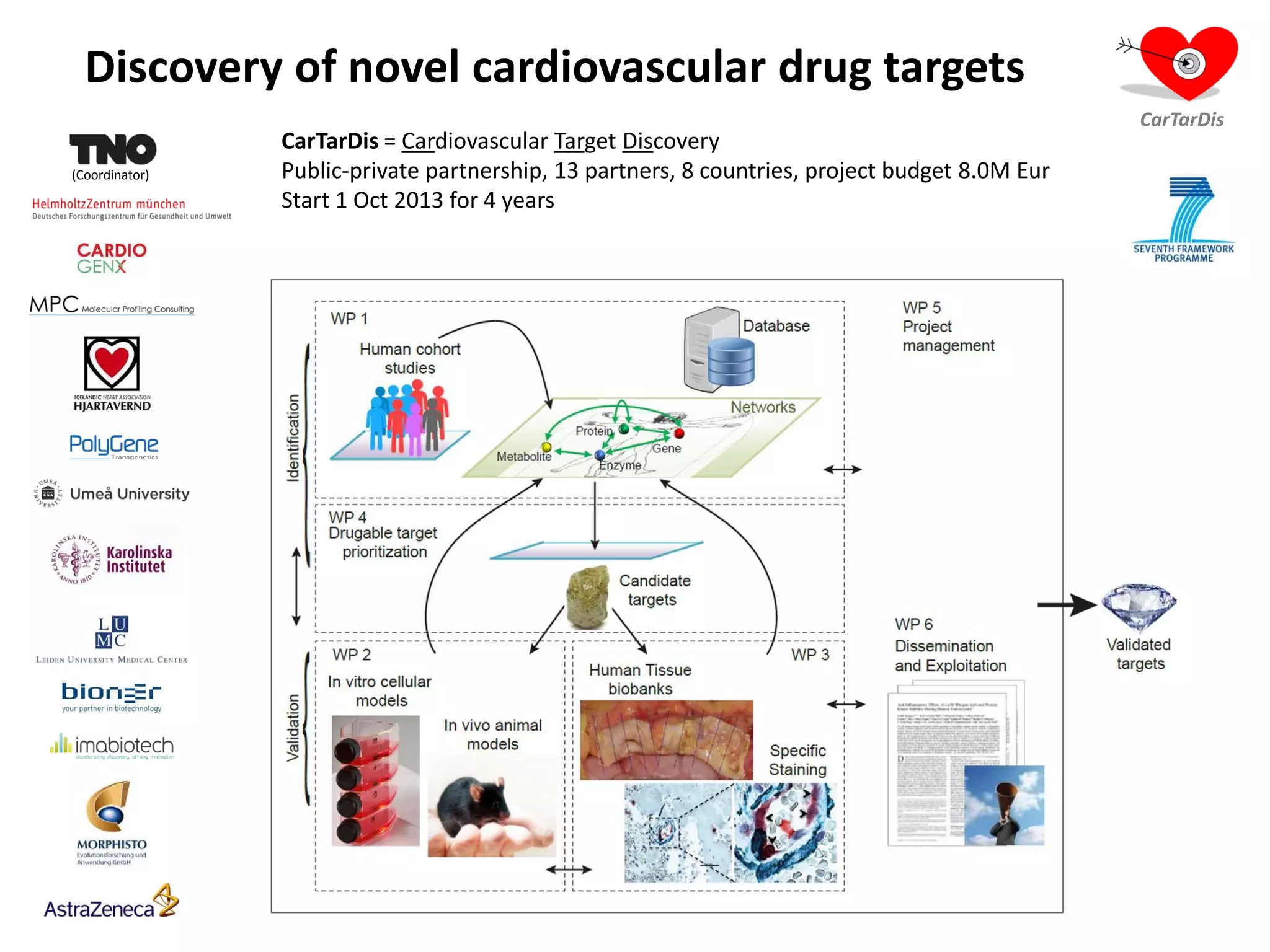 The document describes CarTarDis, a 4-year public-private partnership with 13 partners from 8 countries and a budget of 8.0M Euros that began on October 1, 2013. The project aims to discover novel cardiovascular drug targets through a strong interdisciplinary team with expertise in cardiovascular disease biology, drug discovery, translational medicine, omics technologies, and more. CarTarDis will utilize unique human cohort data, biobanks, CVD models and samples to generate a candidate target database, review targets, validate a shortlist, and create online dossiers to share knowledge on selected targets. The goal is to prioritize 11 targets for further validation activities to identify new treatments for cardiovascular disease.
