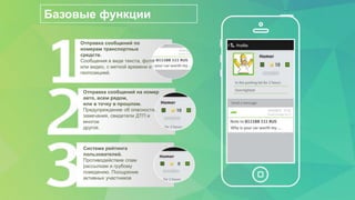 Документ описывает автомобильную систему взаимодействия car2car, позволяющую пользователям обмениваться сообщениями, включая текст, фото и видео, с метками времени и геолокацией. Система предлагает множество функций, таких как поиск попутчиков, помощь при поломке, обнаружение угнанных автомобилей и сбор статистики о вождении, а также возможности для транспортных компаний и органов правопорядка. Кроме того, обсуждаются финансовые аспекты обслуживания и условия тестового периода.