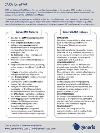 CARA for eTMF is a clinical trial management software package configured for managing electronic trial master file documentation. It is based on an electronic data management reference model. The software allows users to create eTMF structures and documents from configurable templates. It also provides secure external access for investigators and integrations with clinical trial management systems.