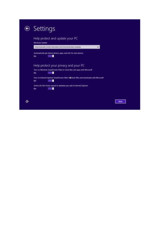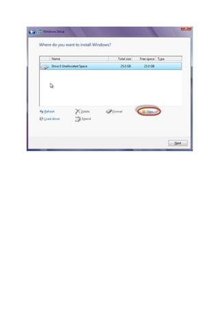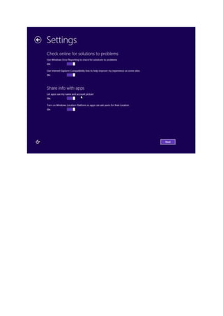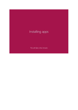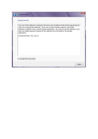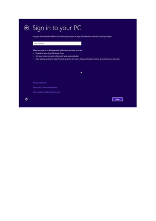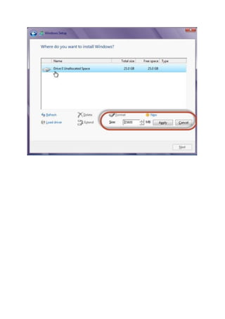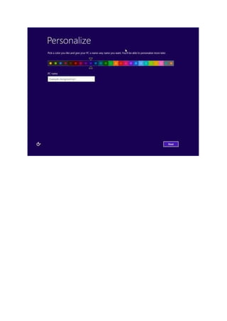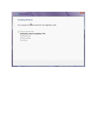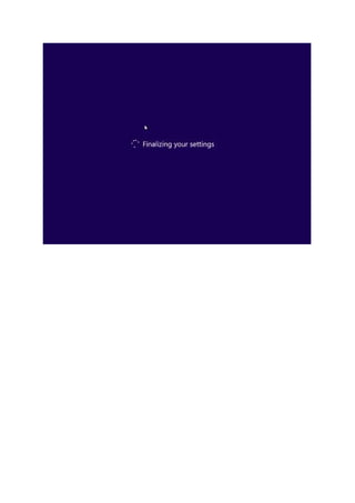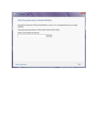 Dokumen ini menjelaskan langkah-langkah untuk menginstal Windows 8 mulai dari booting dengan media instalasi hingga personalisasi setelah instalasi selesai. Pengguna perlu mengatur bahasa, memasukkan kunci produk, memilih partisi untuk instalasi, dan melakukan kustomisasi opsi sesuai preferensi. Akhirnya, pengguna dapat mengakses layar awal Windows 8 dan desktop klasik setelah proses instalasi dan personalisasi selesai.