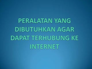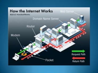 Dokumen tersebut membahas tentang cara kerja Internet, mulai dari jaringan informasi, protokol, alamat IP, domain, hingga komponen-komponen pendukungnya seperti router, gateway, dan server.