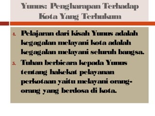 Dokumen ini membahas tentang pengharapan nabi Yunus terhadap kota yang terhukum dan bagaimana Allah memiliki kepedulian terhadap penduduknya. Juga dijelaskan tentang cara menjadi kota suci melalui keterlibatan dalam pelayanan, dukungan bagi kegiatan sosial, dan mendekati komunitas minoritas. Terakhir, mahasiswa diharapkan mempelajari strategi pelayanan perkotaan dari rasul Paulus.