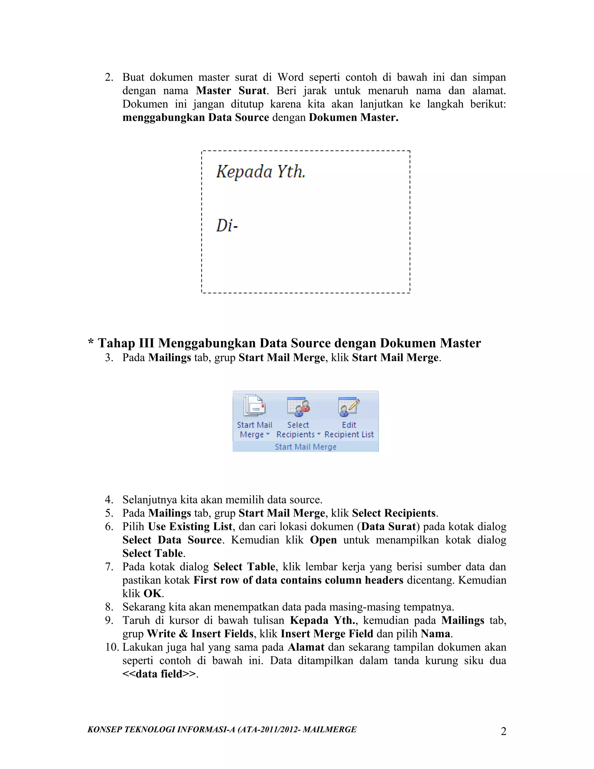Dokumen ini menjelaskan langkah-langkah membuat mail merge di Word 2007, yang memungkinkan pembuatan dokumen seragam untuk berbagai penerima secara efisien. Proses ini melibatkan dua dokumen: dokumen master dan data source yang berisi informasi spesifik penerima. Penggunaan Excel sebagai data source dipilih karena kemudahan pengelolaan dan pengeditan data.