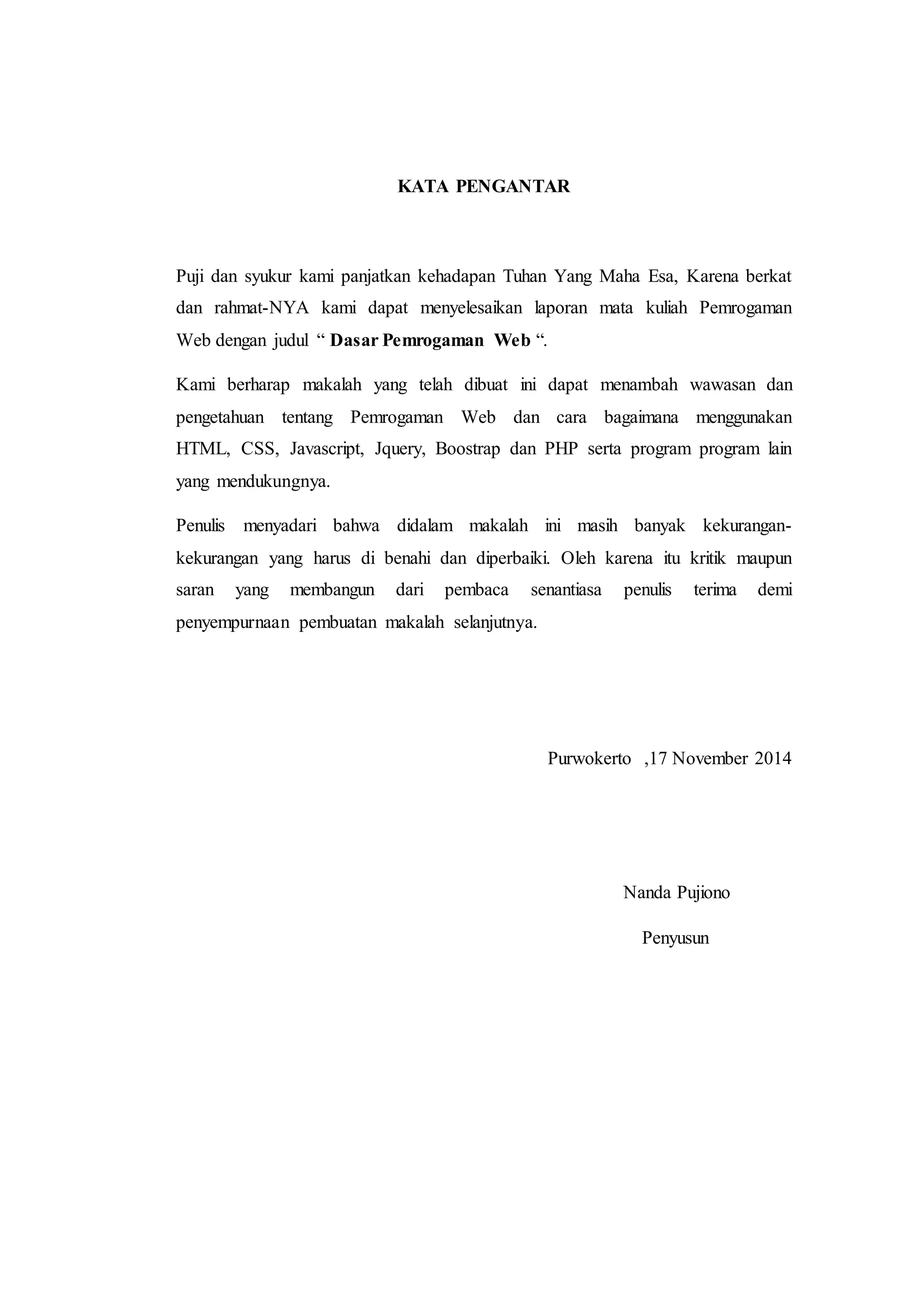 Dokumen ini adalah laporan praktikum dasar pemrograman web yang memberikan pemaparan tentang HTML, CSS, JavaScript, jQuery, Bootstrap, dan PHP. Penulis, Nanda Pujiono, menyusun laporan ini untuk memenuhi tugas kuliah dan berharap dapat memberikan wawasan bagi pembaca. Terdapat berbagai contoh kode dan penjelasan mengenai cara penggunaan masing-masing teknologi web tersebut.