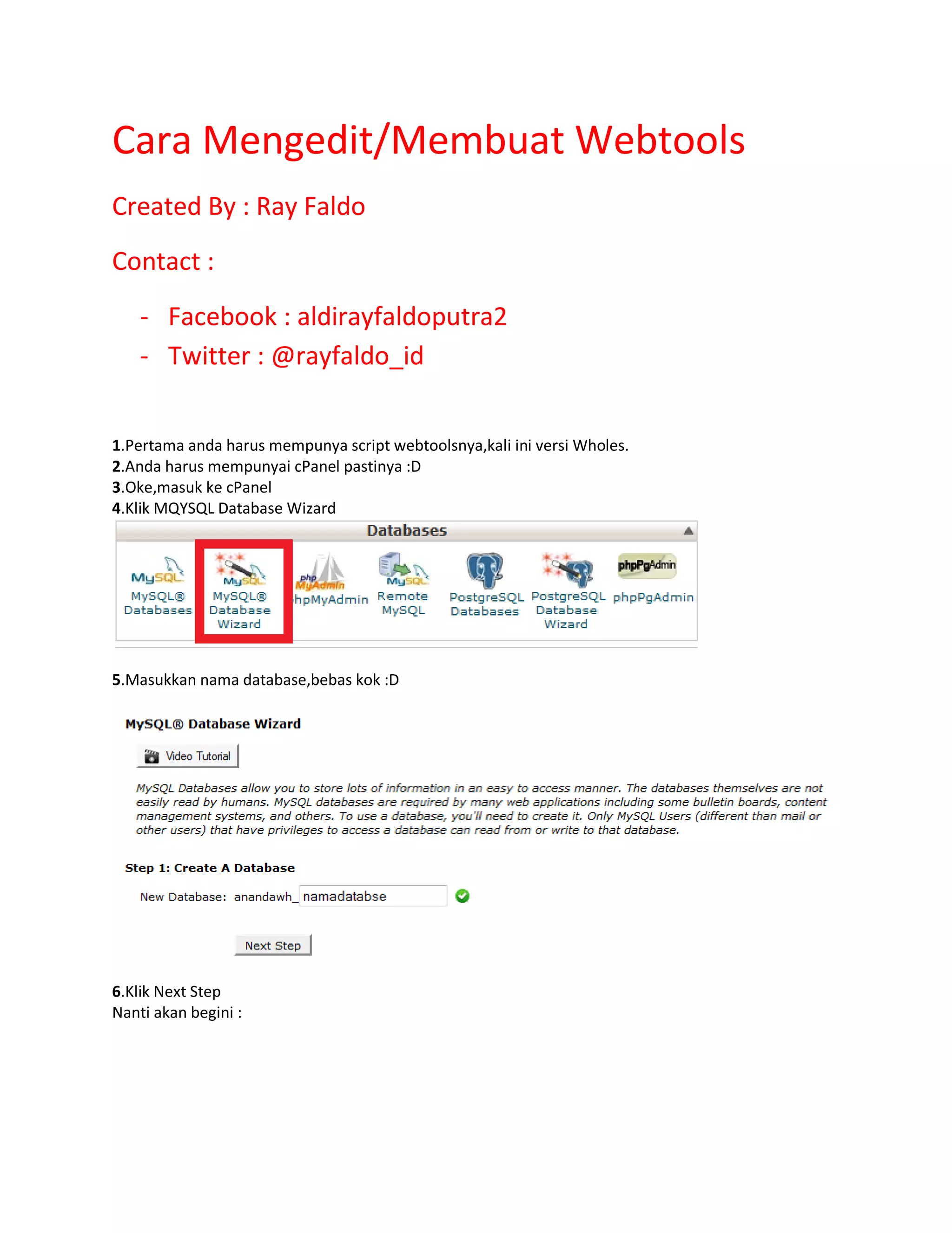 Dokumen ini memberikan instruksi lengkap untuk mengedit dan membuat webtools dengan mengikuti langkah-langkah berikut: (1) Mendapatkan script webtools, (2) Membuat database melalui cPanel, (3) Mengkonfigurasi koneksi database pada file-file tertentu, (4) Membuat aplikasi Facebook dan mengkonfigurasi file-file terkait.