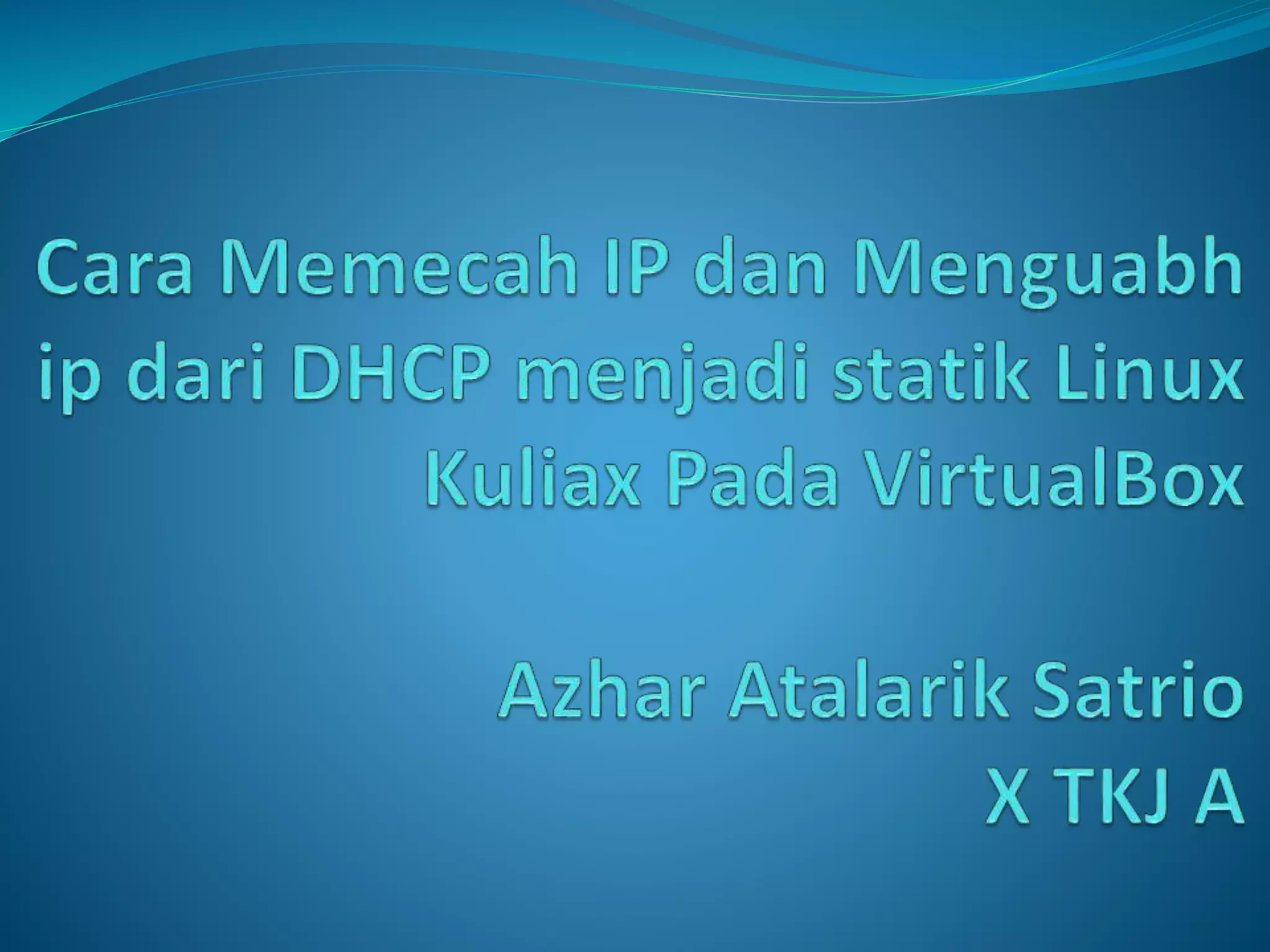 Dokumen ini memberikan instruksi untuk login ke terminal, mengubah konfigurasi IP interface eth0 dan eth1 menjadi 10.0.2.20 dan 10.0.2.30, dan mengecek konfigurasi baru menggunakan perintah netstat -rn untuk memastikan IP sudah terpecah.